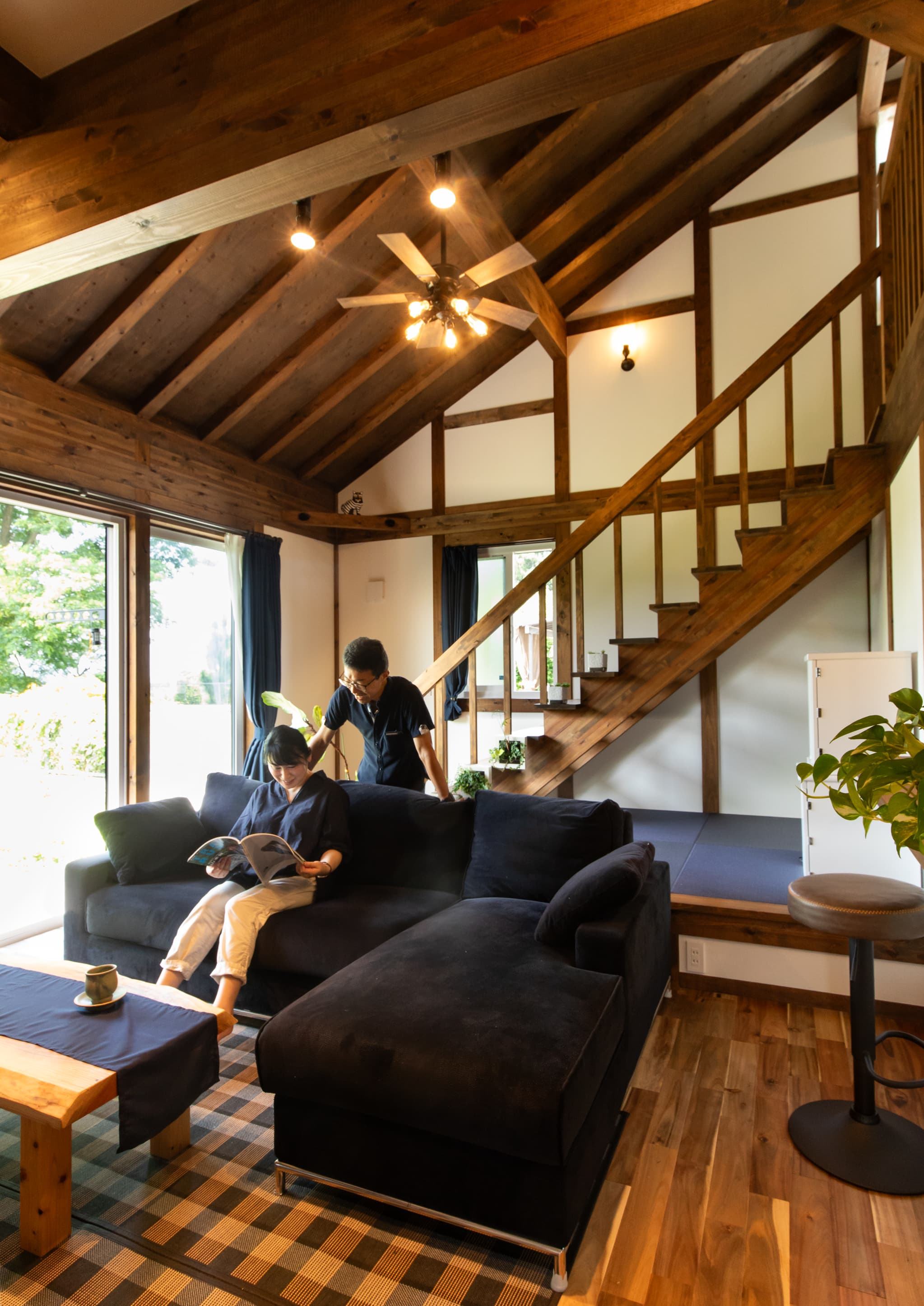吹抜けのあるリビングは梁や勾配天井が生み出す開放感と、自然光に包まれる心地よさを両立。