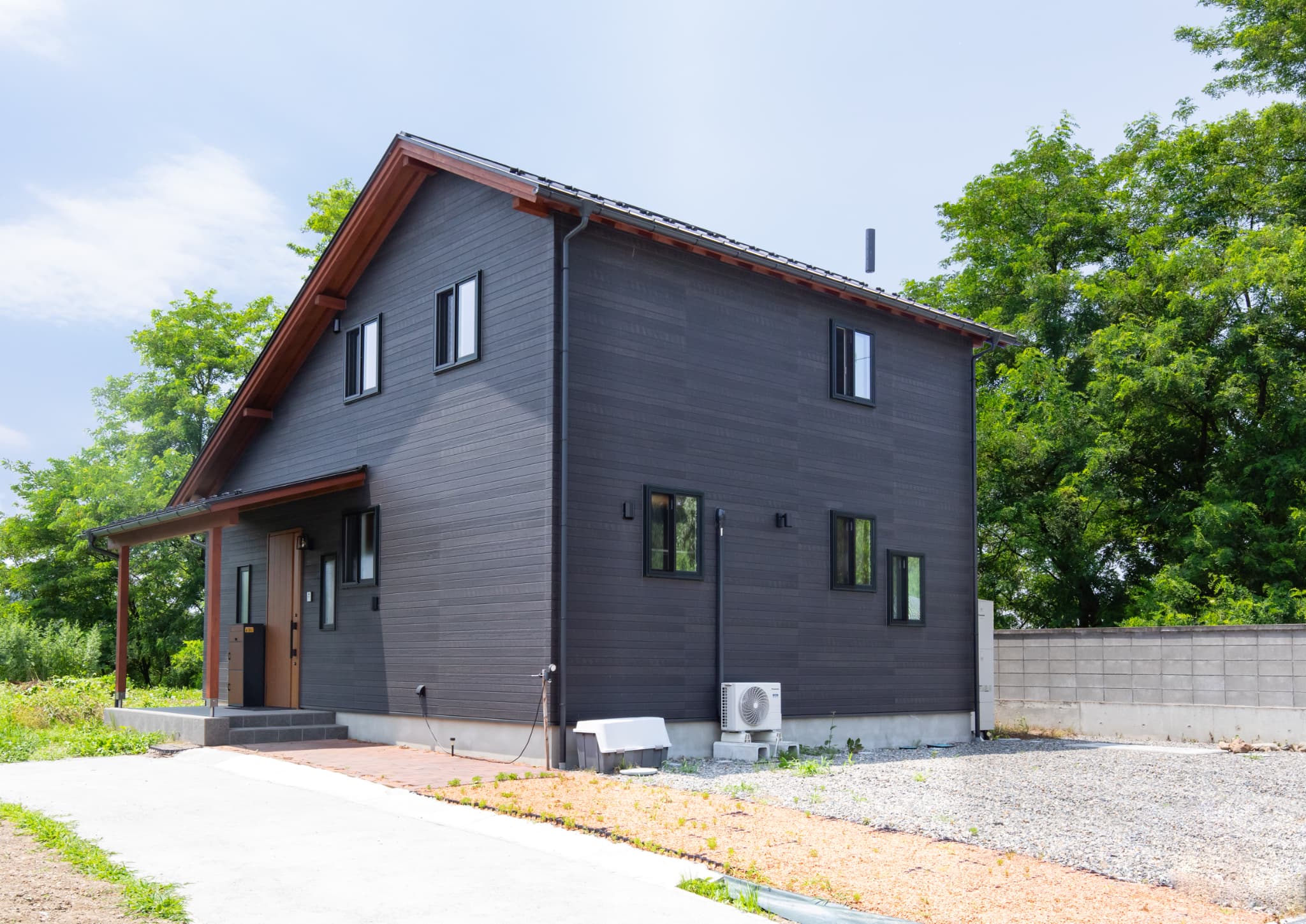 落ち着いた外観デザインが印象的な住まい。無垢材の質感を活かした、暖かみのある空間づくりが魅力的。