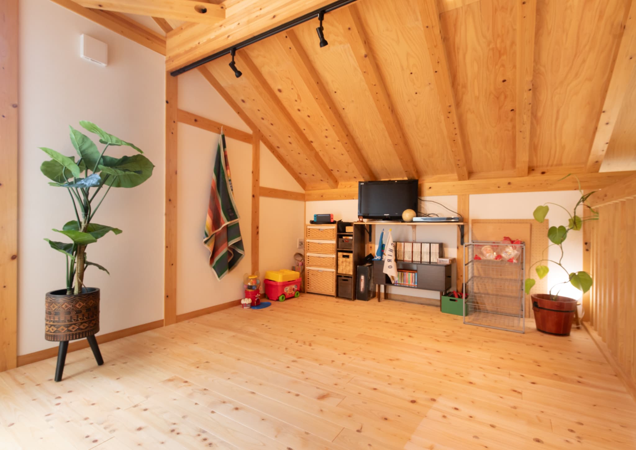 吹抜けのあるLDKは梁と勾配天井が生み出す開放感と木のぬくもりが心地よく調和する空間となっている。