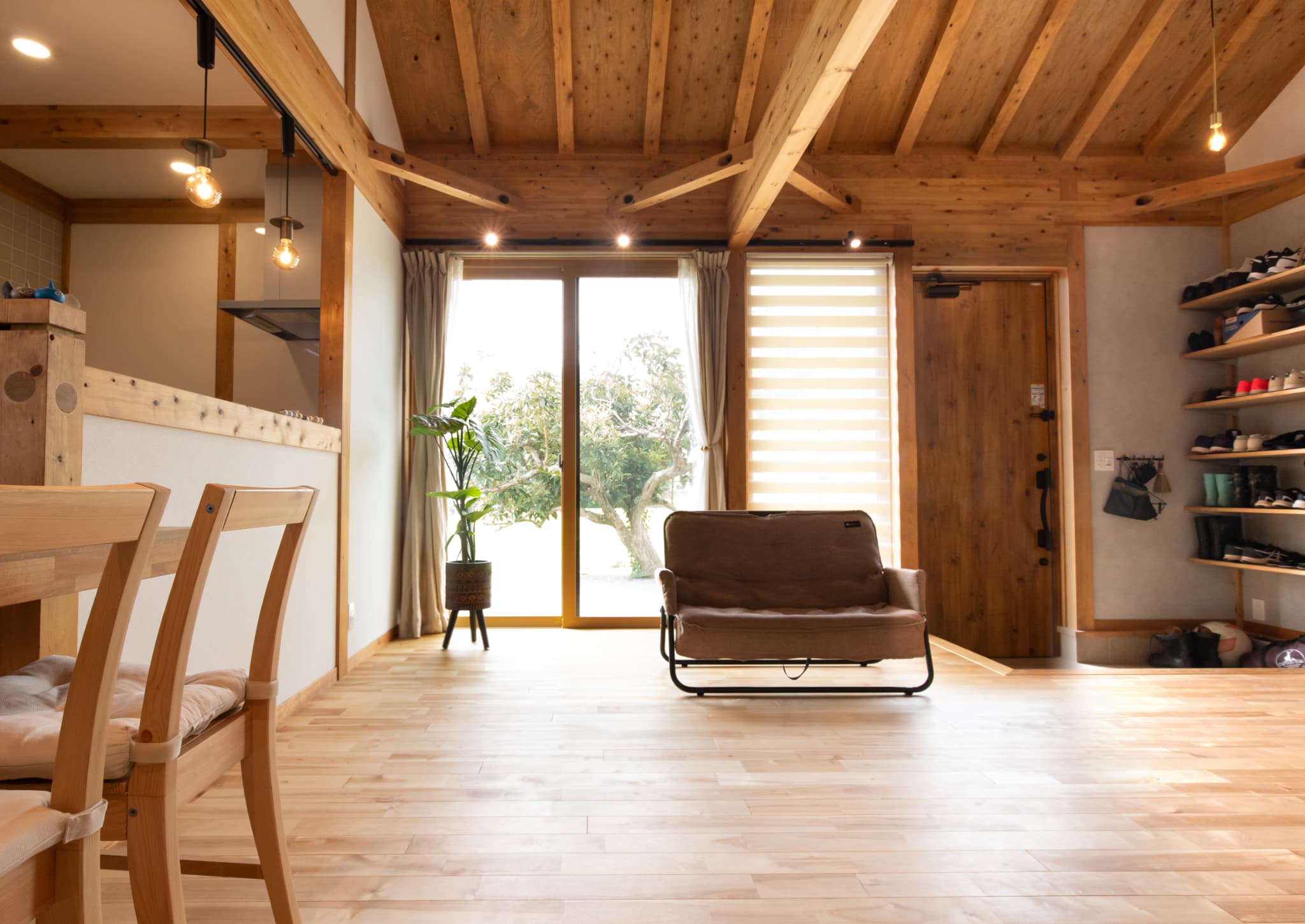無垢材の梁と柱が美しく映える、開放感あふれるLDK。