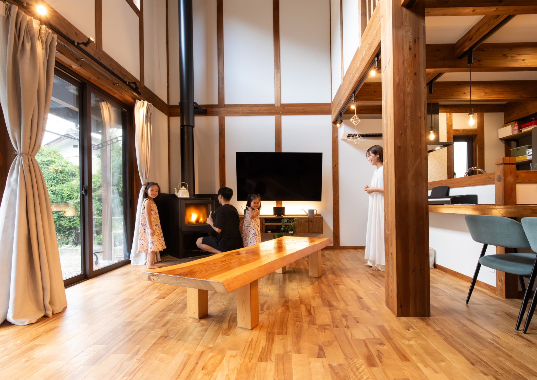 薪ストーブのあるこの住まいは、家族の時間を大切にしながら、四季の移ろいを愉しむ暮らしを叶えてくれる一棟だ。