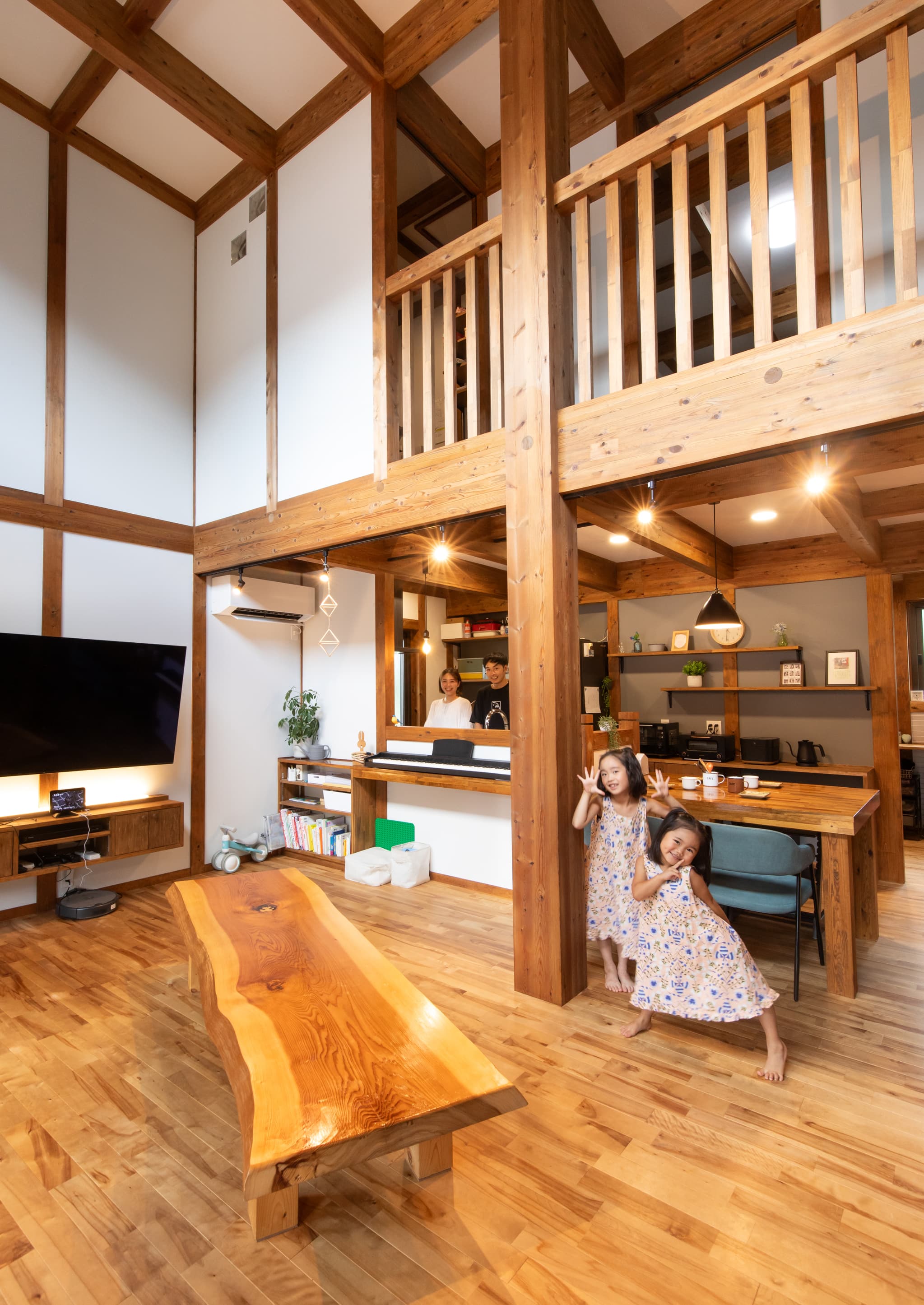 吹抜けのあるリビングは、家族の気配を感じながらそれぞれが思い思いに過ごせる場所に。