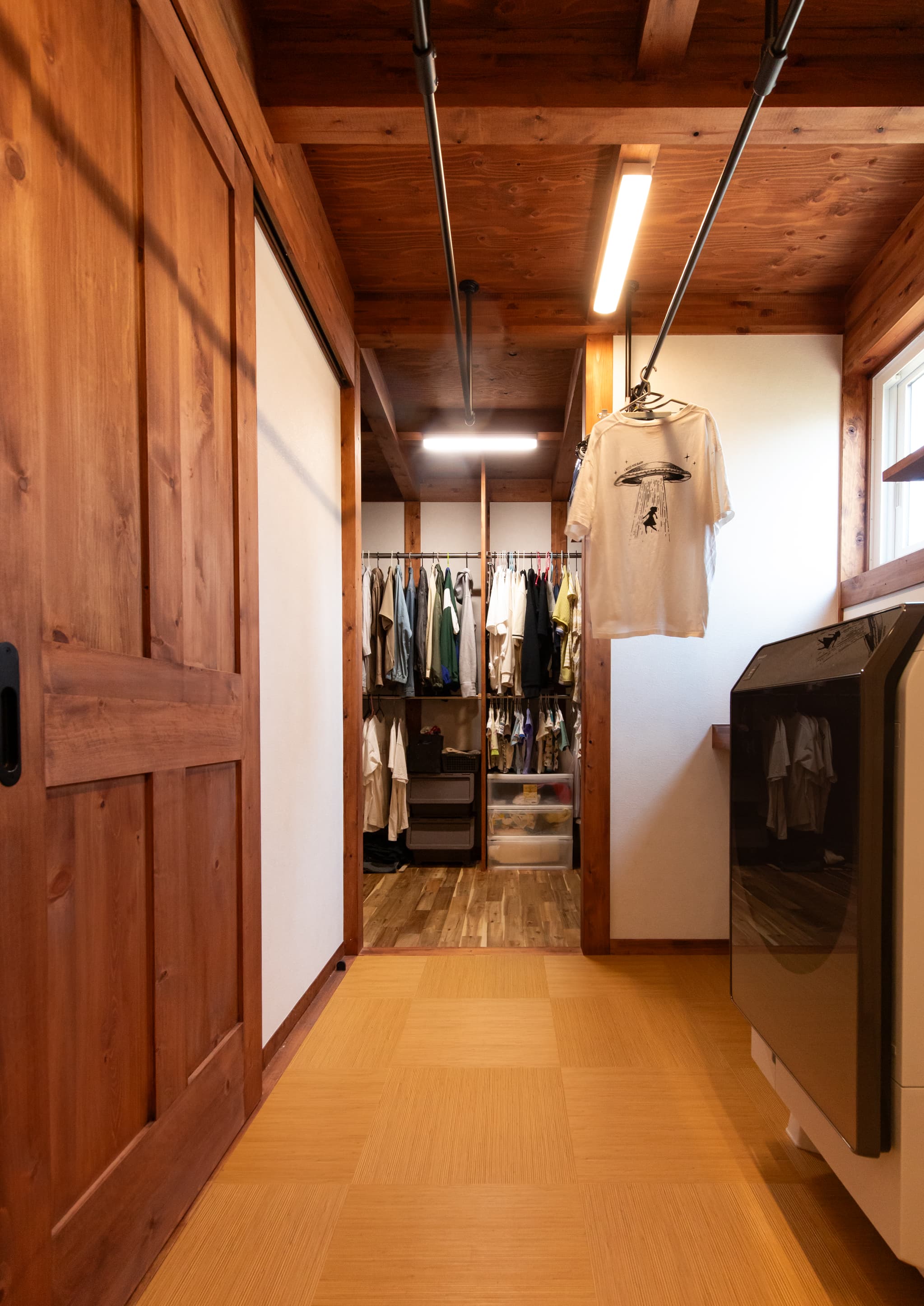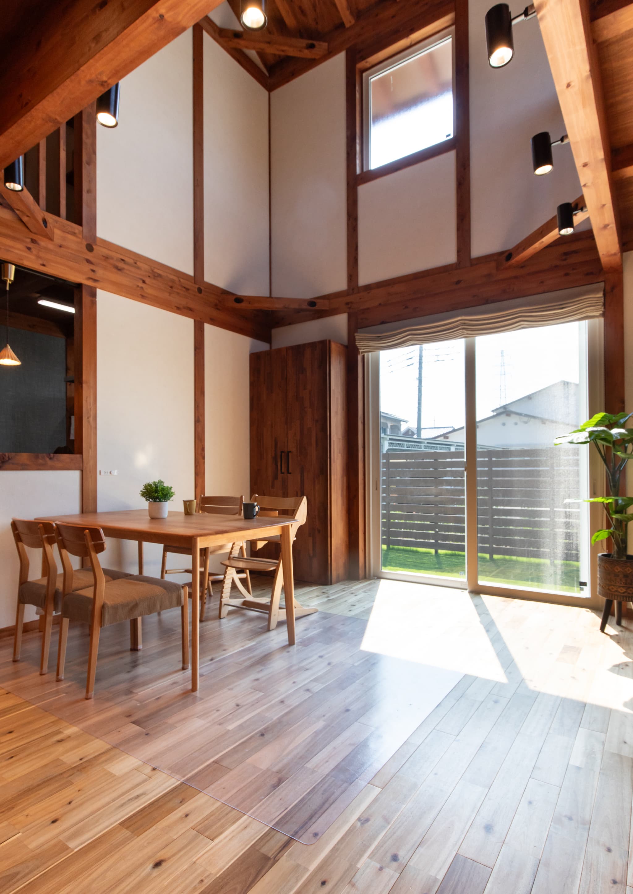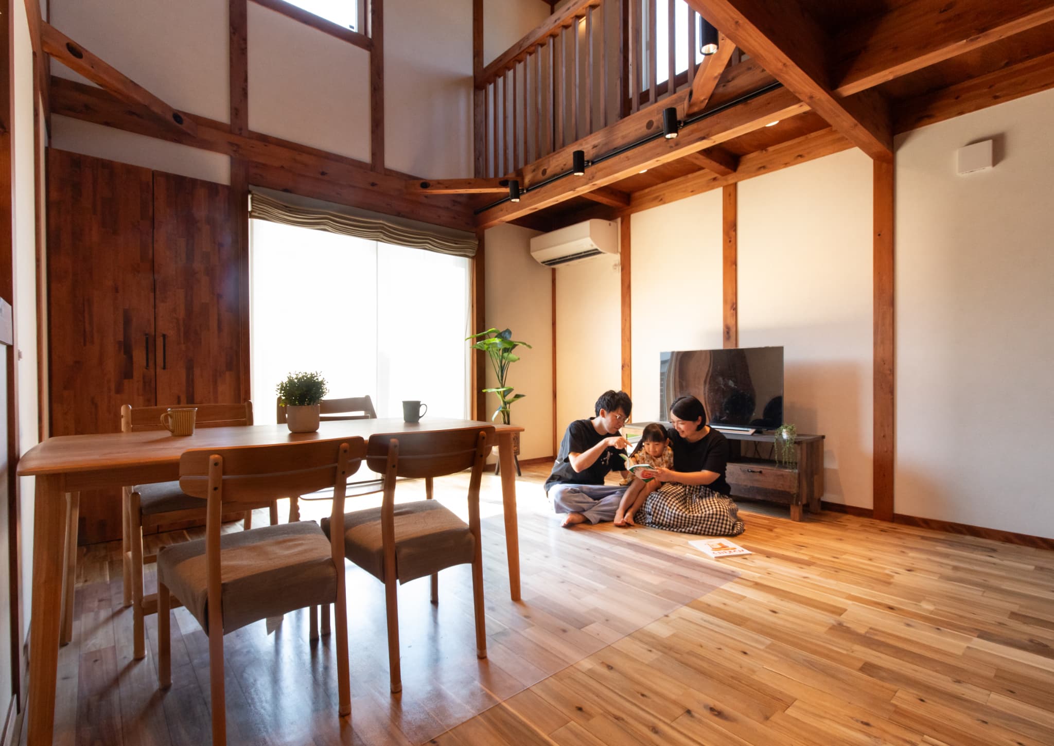 室内は、チェリー色のオイルで仕上げた無垢材がやさしい赤みを帯び、家族を包み込むような温もりを感じさせてくれる。