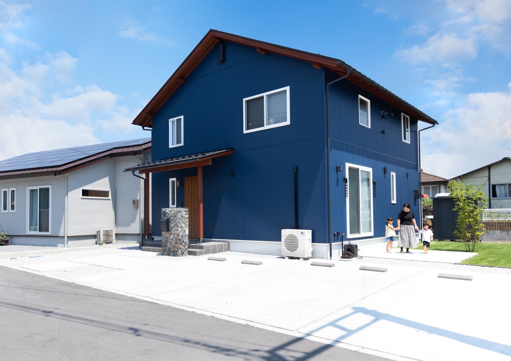 深みのあるブルーのガルバリウムが印象的な外観の子育て世代のための住まい。