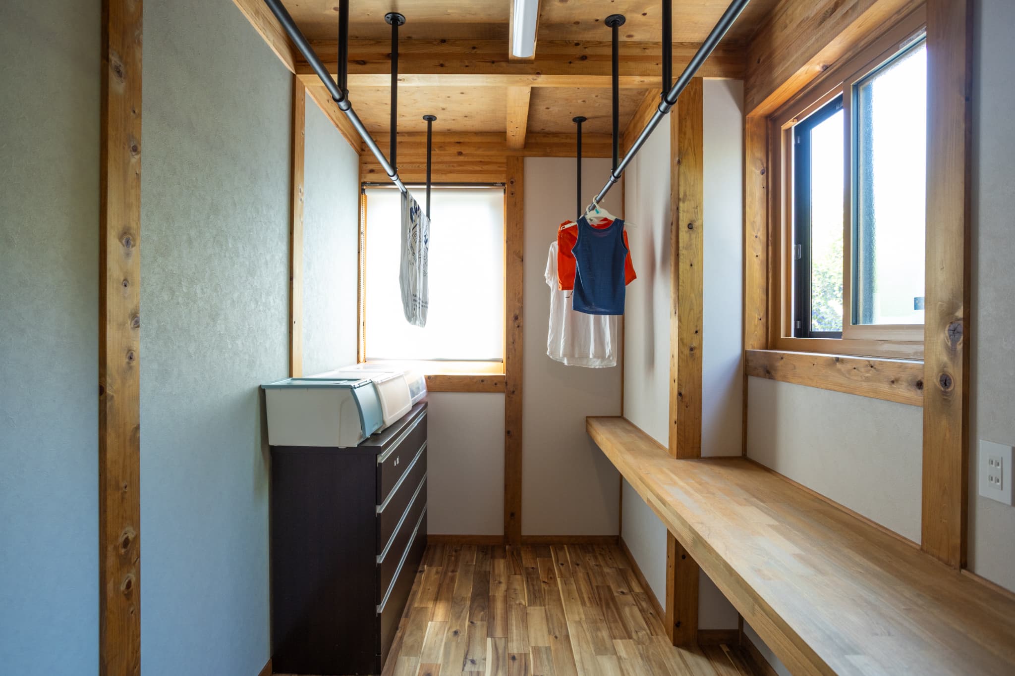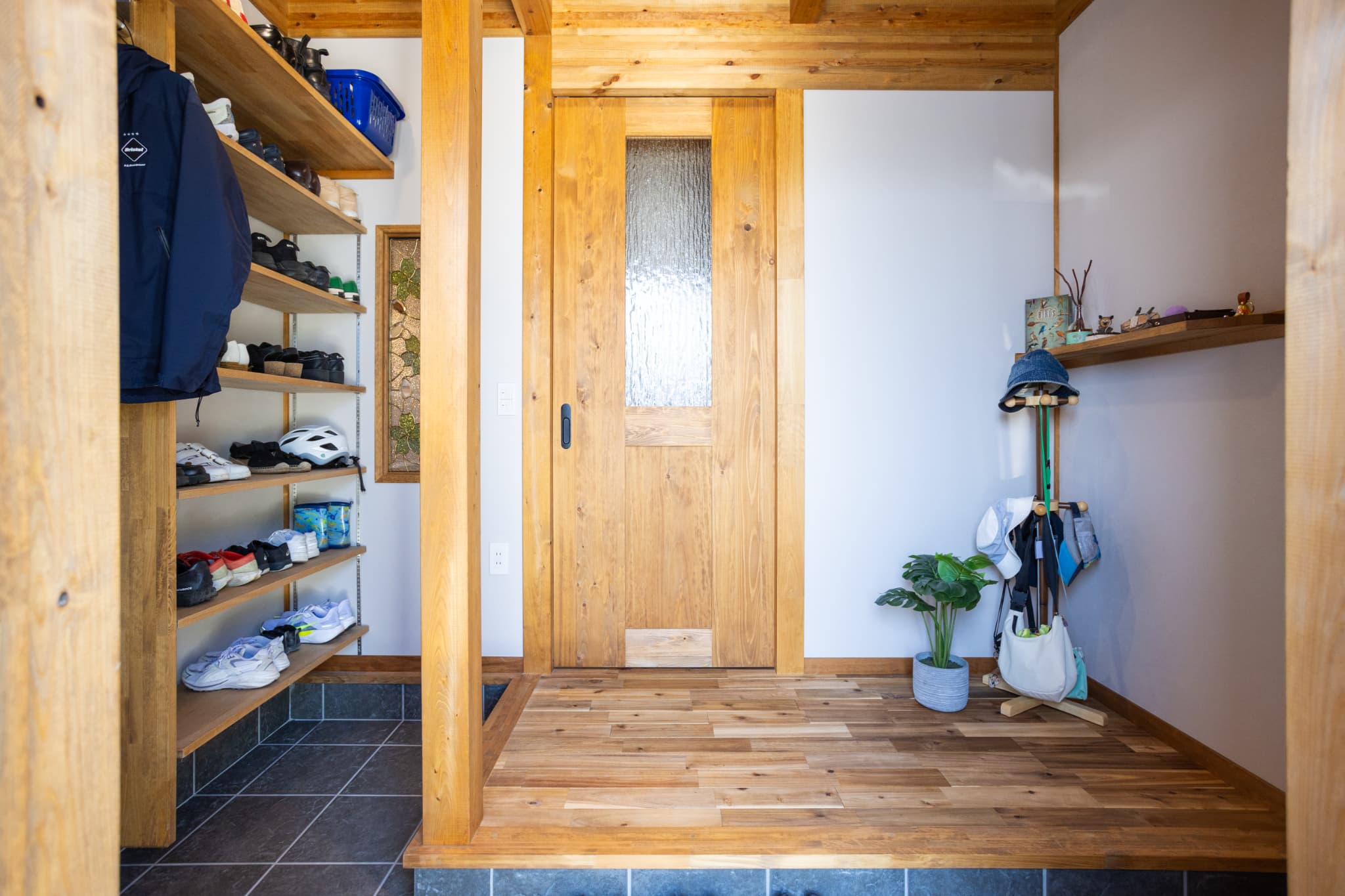 大きな吹抜けに木の梁や柱を現しで設えた、伸びやかな住まい。