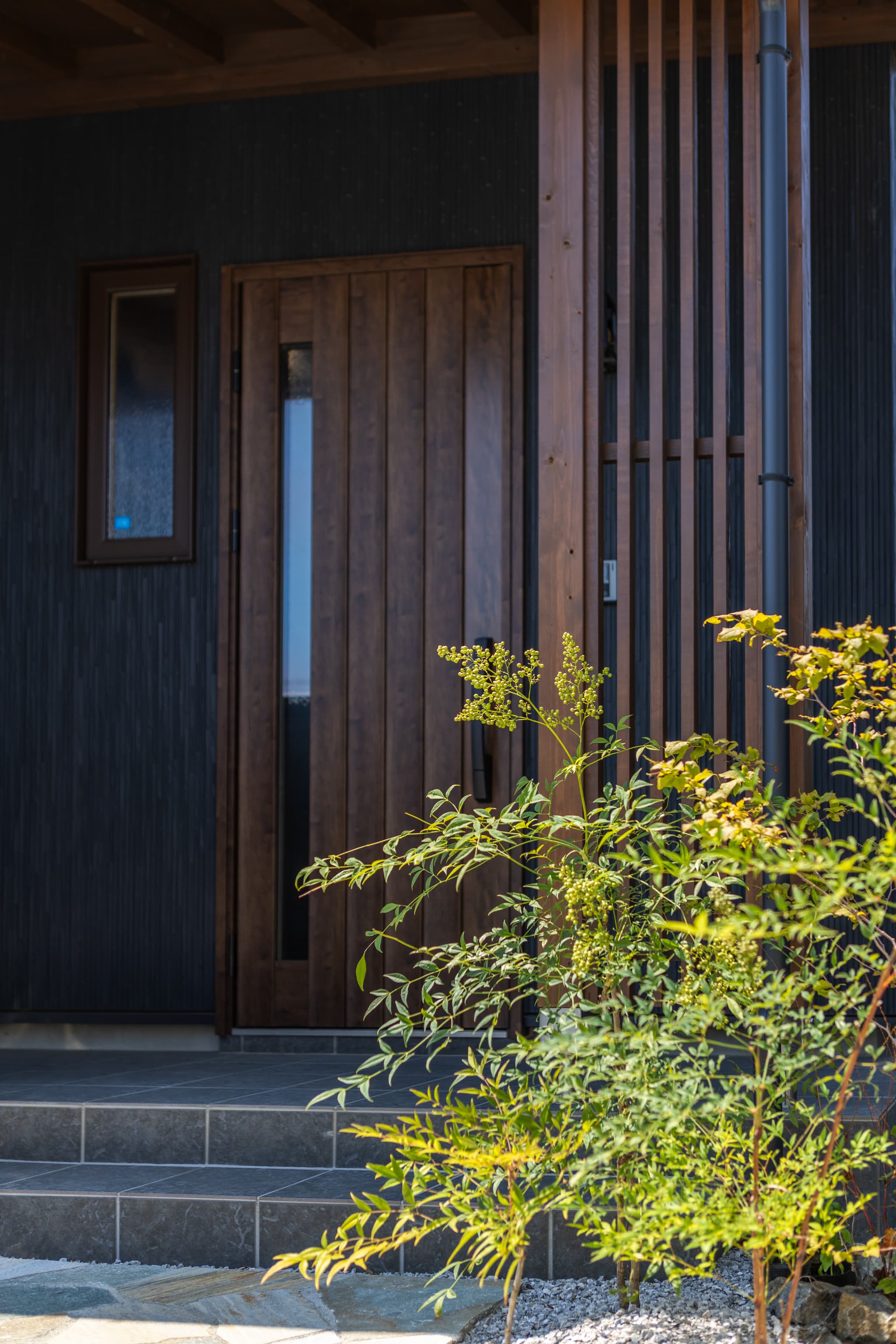 外観は深みのある色合いに木格子を組み合わせ、端正でありながらもやわらかな印象に仕上がっている。