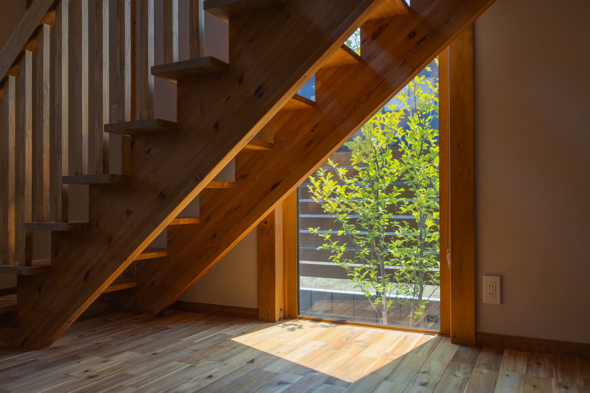 上下階がひとつの空間としてつながり、光と風が家の奥まで行き渡る設計。
