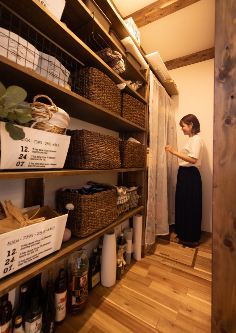 丸型に切り抜かれたかわいい入り口のパントリーも沢山収納出来る様に、隠せるようにしてもらっています!