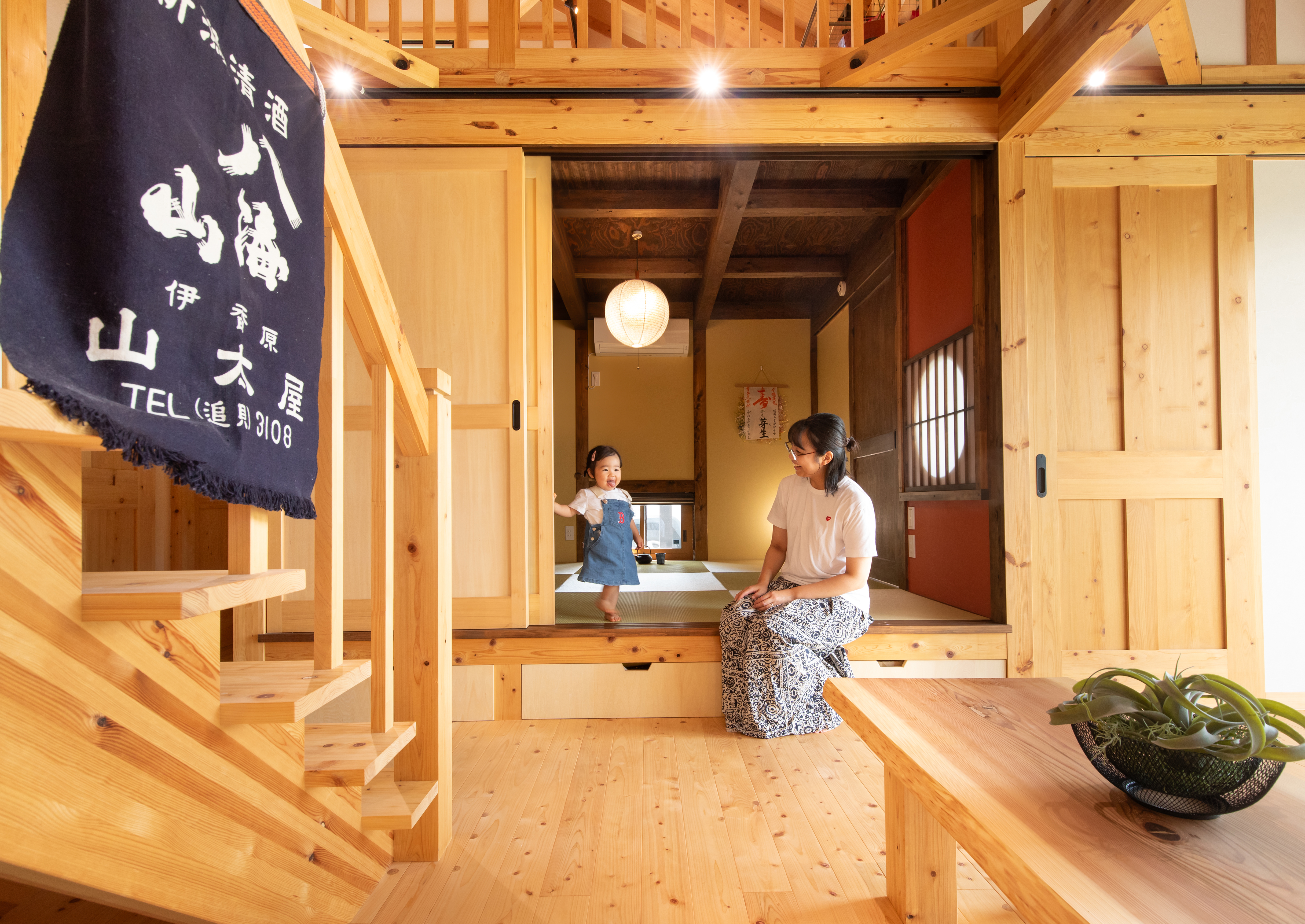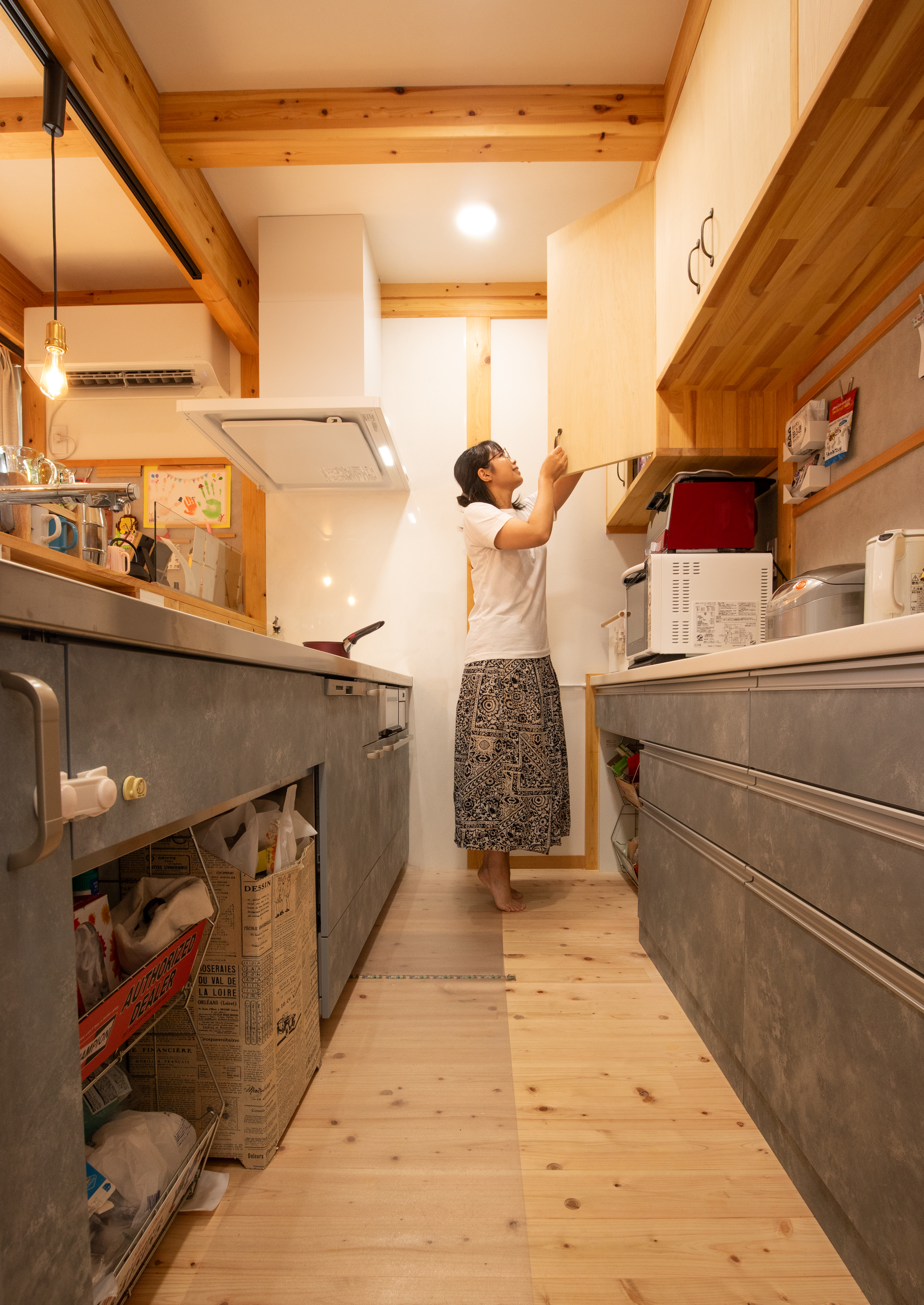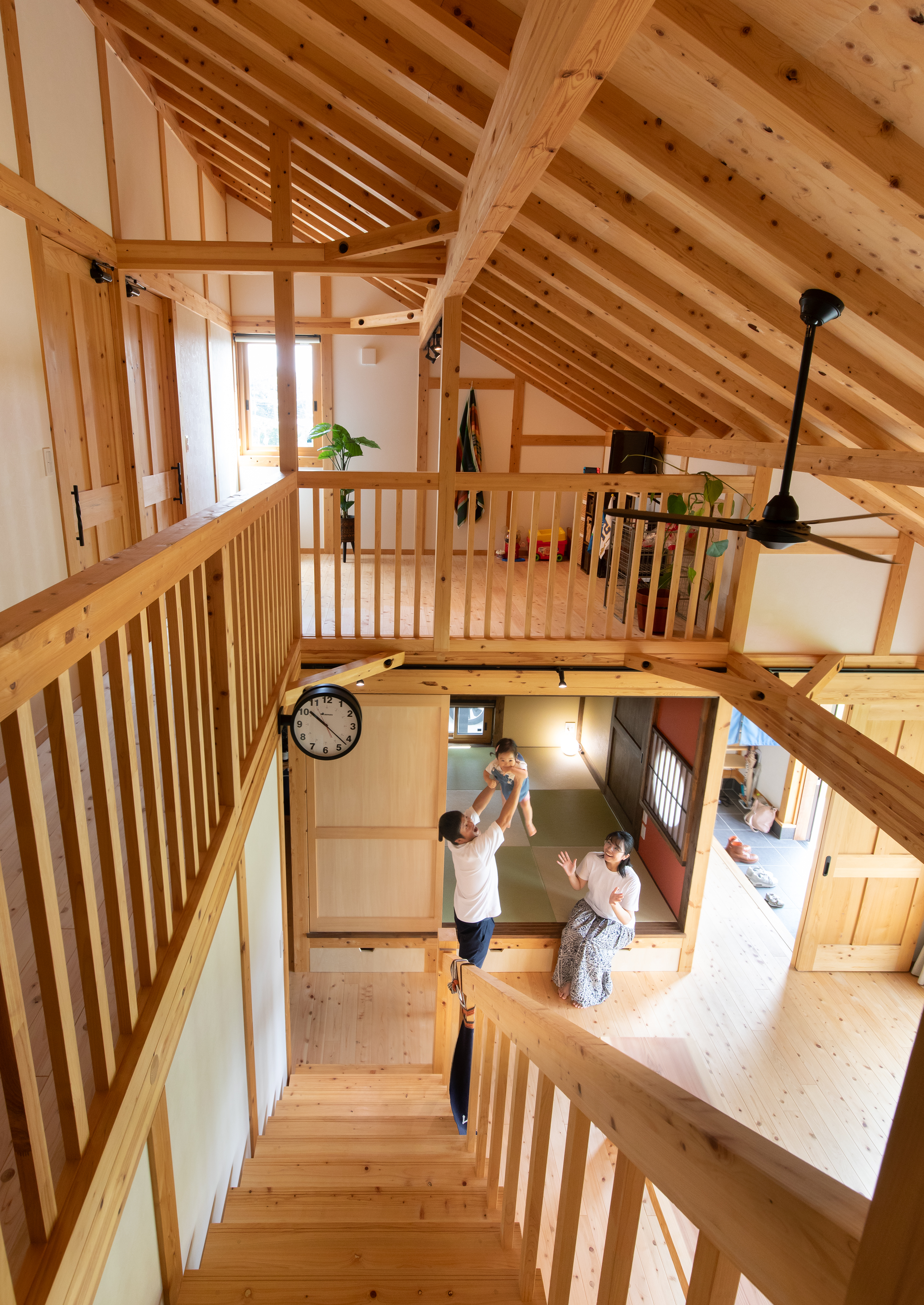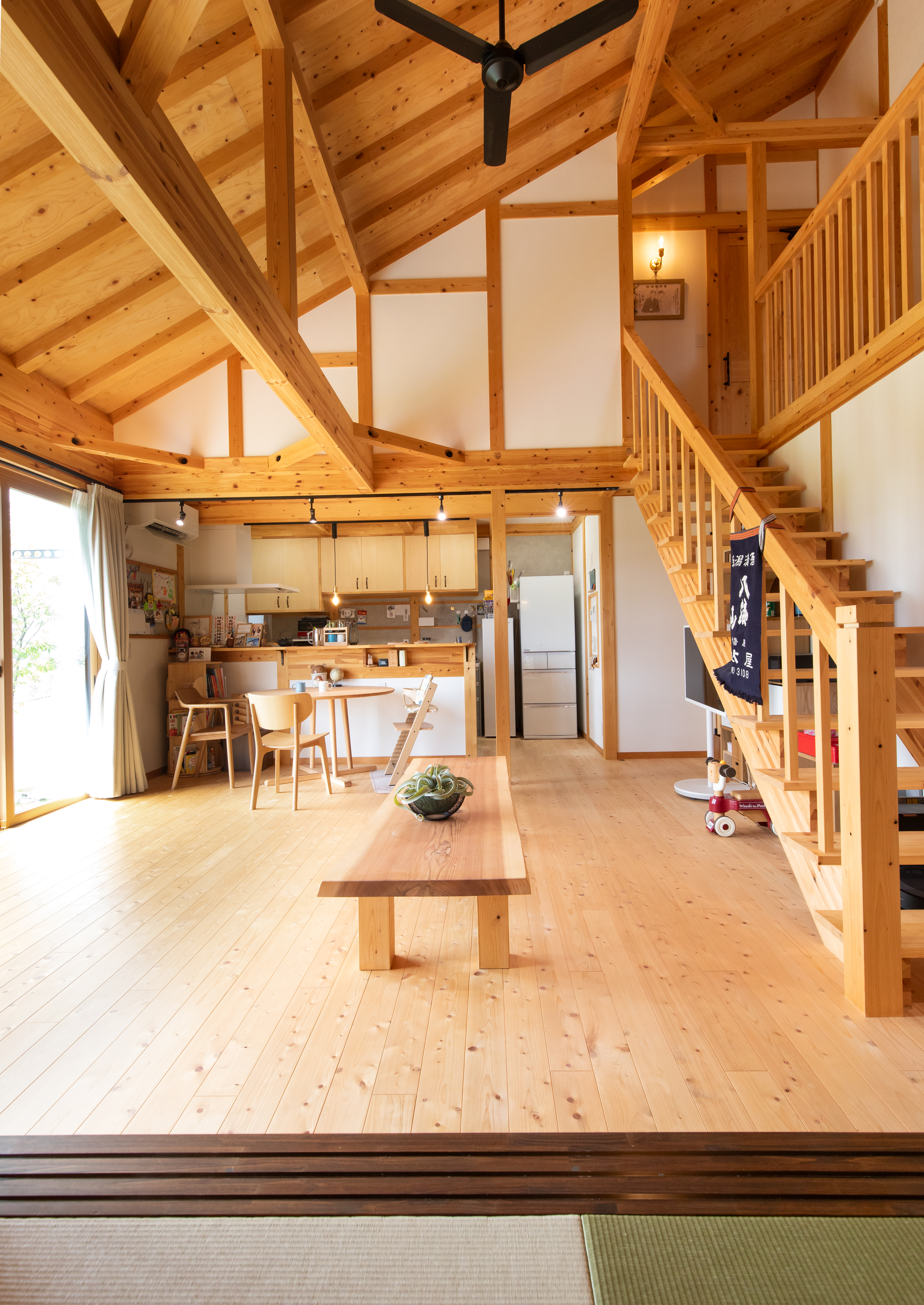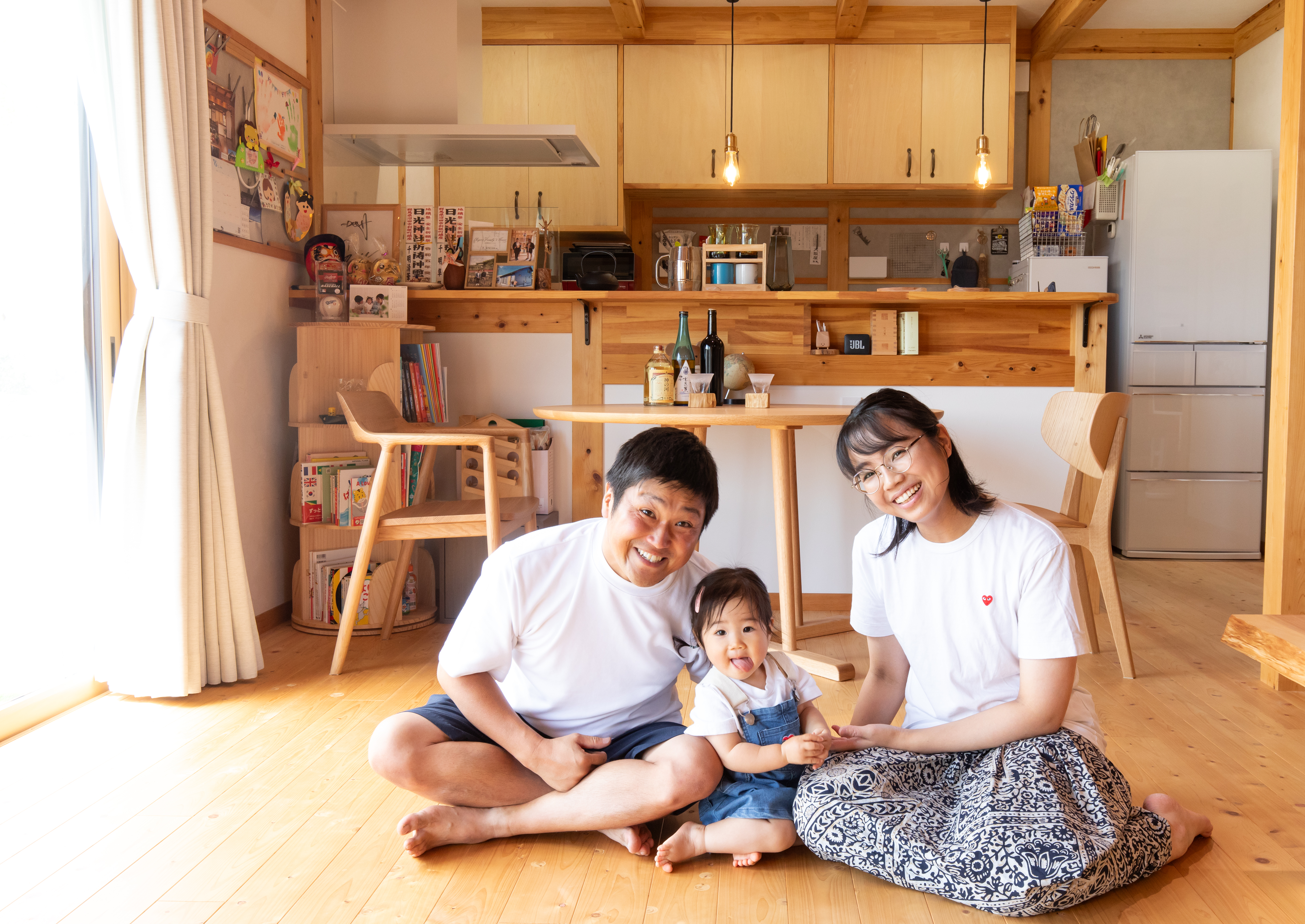 入居してから約2年。実際に暮らしてみて感じるのは、「想像以上に住みやすい」ということです。1階に主寝室を設けたことで生活動線がスムーズになり、家事や子育てに負担を感じることはほとんどありません。広いリビングには自然と家族が集まり、子どもたちは裸足で走り回っています。木の床は冬でも冷たさを感じにくく、夏はさらりとしていて心地いい。憧れだった木のぬくもりに包まれる暮らしを、日々満喫しています。